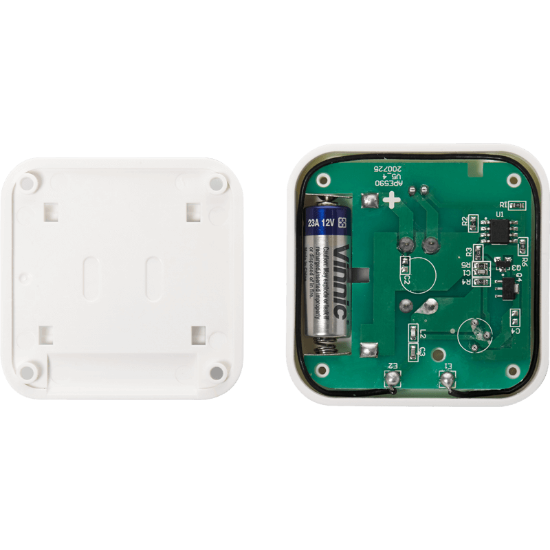 Компактное устройство имеет белый корпус с кнопкой “Вызов”. В комплекте имеется двусторонний скотч и шурупы для крепления на вертикальной или горизонтальной поверхности. Батарея легко заменяется: достаточно отделить устройство от контактной площадки.