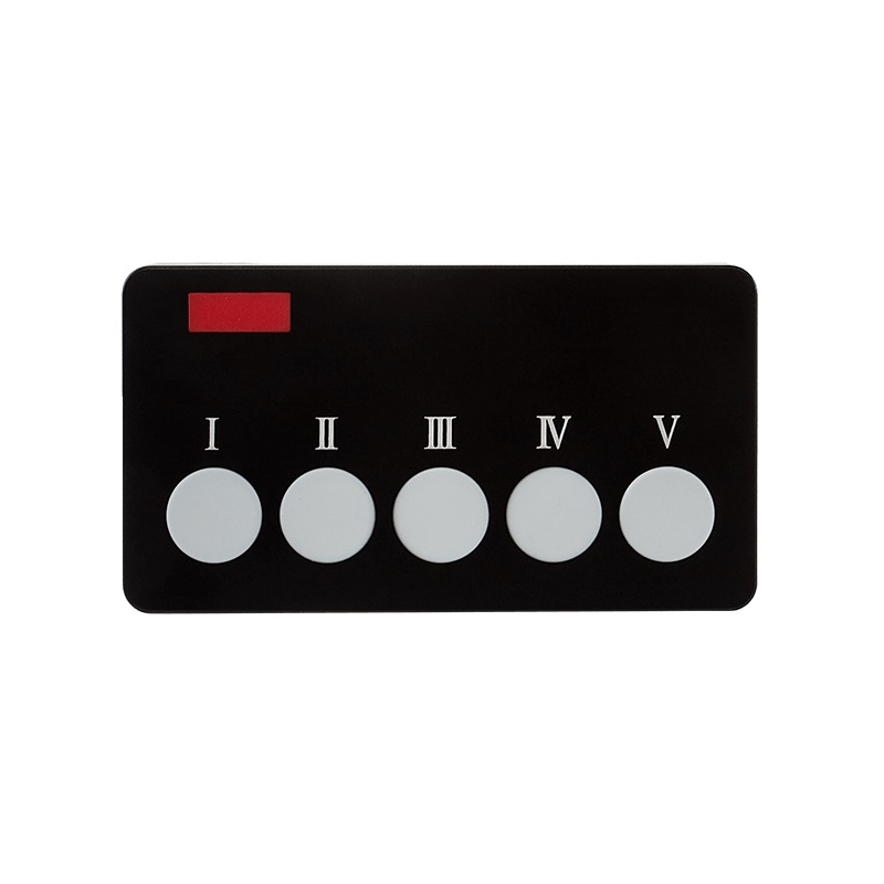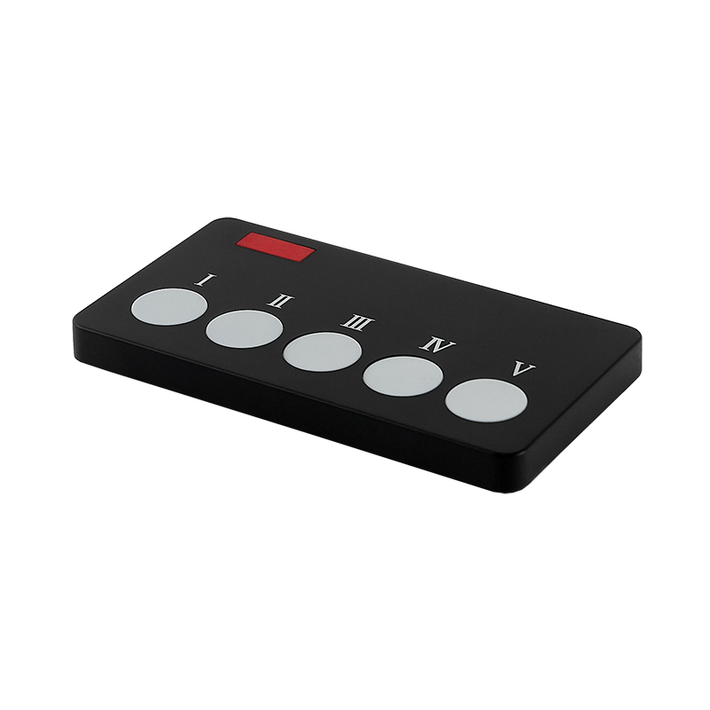 Компактный черный корпус снабжён пятью кнопками, каждая соответствует пейджеру одного из официантов. На задней части – прорезиненные накладки, которые не дают пульту скользить по гладкой поверхности.