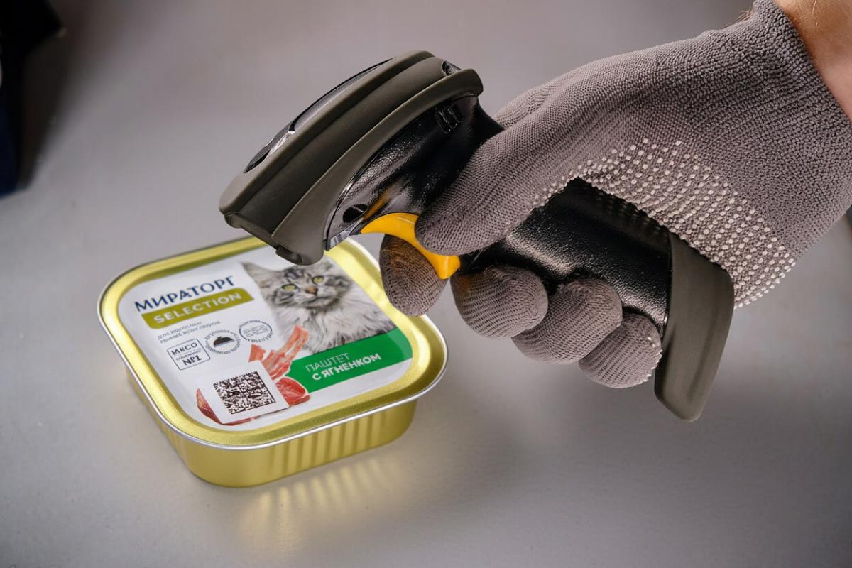 Поставьте 2D-сканер, способный считывать уникальные коды DataMatrix на упаковках корма. На кассе чаще всего используют ручные проводные или стационарные настольные модели.
