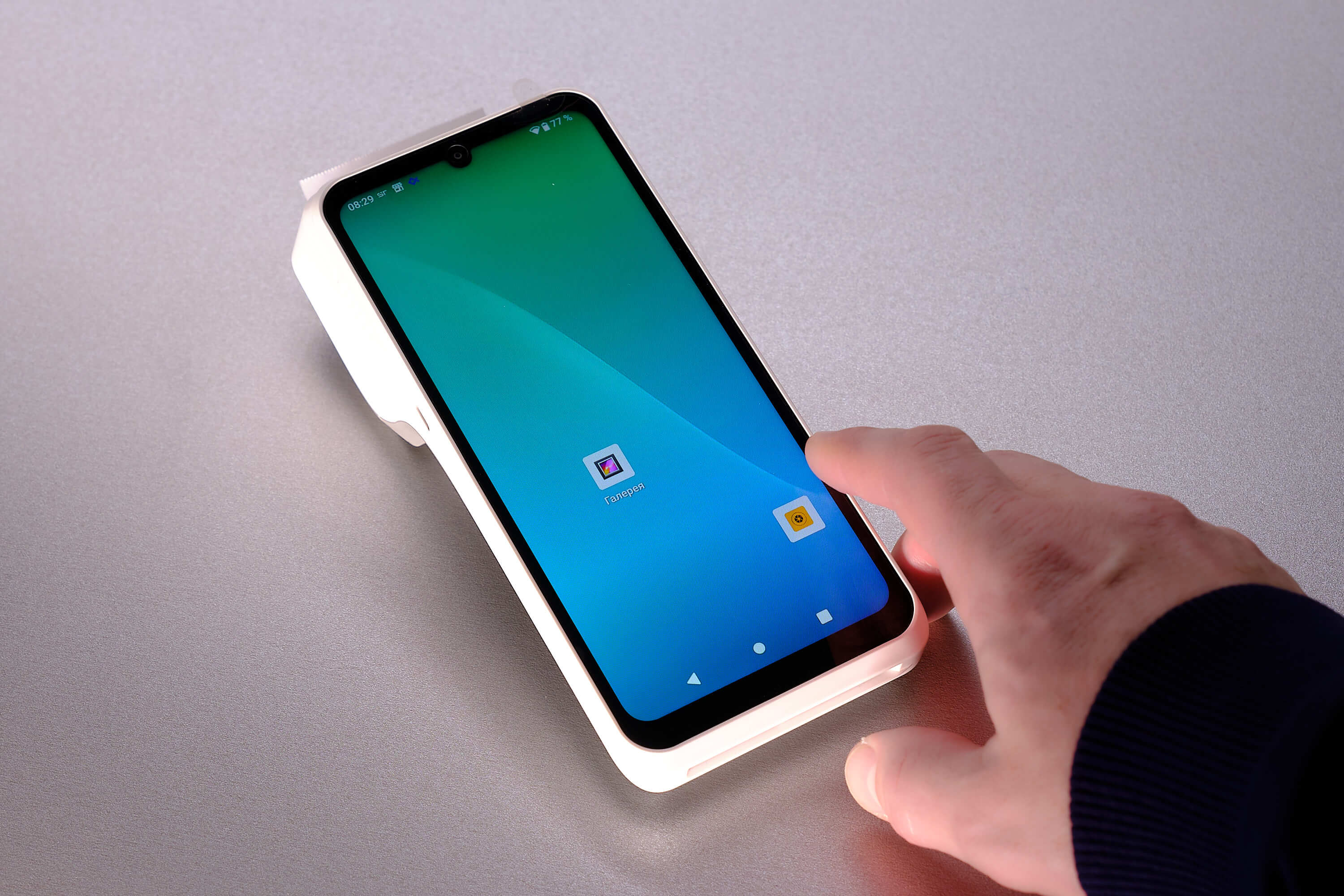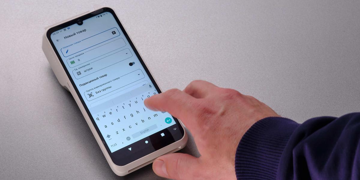 Кассир работает с сенсорным дисплеем диагональю 6,745″. Довольно крупная диагональ, чтоб выбивать чеки, но достаточно компактный корпус, чтобы касса оставалась мобильной.
